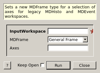 This algorithm allows the user to set the MDFrame type for each axis on a workspace. The algorithm makes it possible to introduce the correct MDFrame type to workspaces which are associated with legacy files. Note that this can only be applied to MDHisto and MDEvent workspaces.