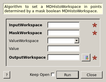 | MaskWorkspace | Input | IMDHistoWorkspace | Mandatory | A mask MDHistoWorkspace, where true indicates where to set the value. |