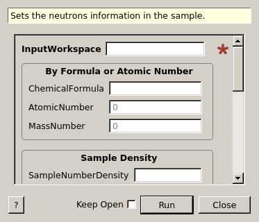 | NumberDensityUnit | Input | string | Atoms | Choose which units SampleNumberDensity referes to. Allowed values: [‘Atoms’, ‘Formula Units’] |