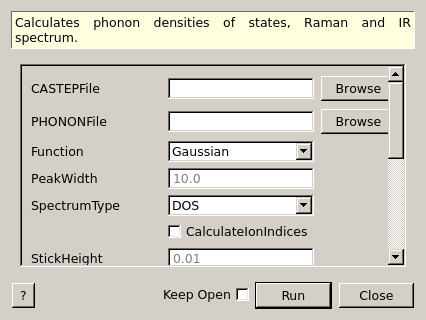 Calculates phonon densities of states, Raman and IR spectrum from the output of CASTEP code obtained in the form of .phonon and .castep files.