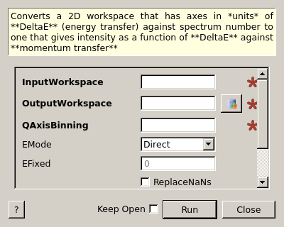 | OutputWorkspace | Output | MatrixWorkspace | Mandatory | The name to use for the q-omega workspace. |