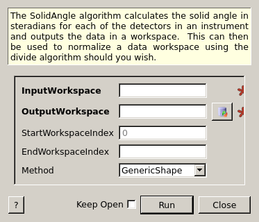 | StartWorkspaceIndex | Input | number | 0 | The index number of the first spectrum for which to find the solid angle (default: 0) |