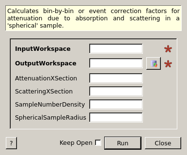Calculates bin-by-bin or event correction factors for attenuation due to absorption and scattering in a spherical sample. Sample data should be divided by these corrections. Algorithm calls AnvredCorrection v1.