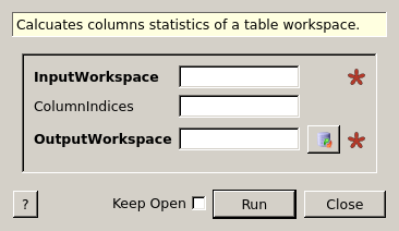 | OutputWorkspace | Output | TableWorkspace | Mandatory | Output workspace containing column statistics. |