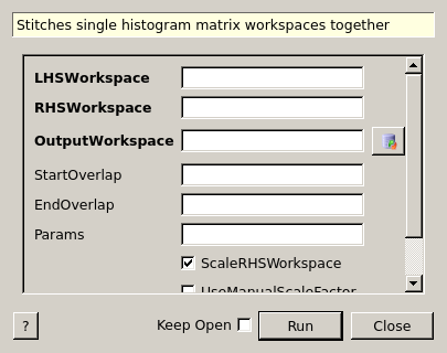 | OutputWorkspace | Output | MatrixWorkspace | Mandatory | Output stitched workspace. |