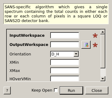 SANS-specific algorithm which gives a single spectrum containing the total counts in either each row or each column of pixels in a square LOQ or SANS2D detector bank.