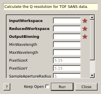 | InputWorkspace | InOut | MatrixWorkspace | Mandatory | Name the workspace to calculate the resolution for |
