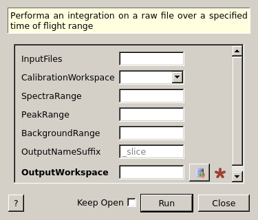 | OutputNameSuffix | Input | string | _slice | Suffix to append to raw file name for name of output workspace |