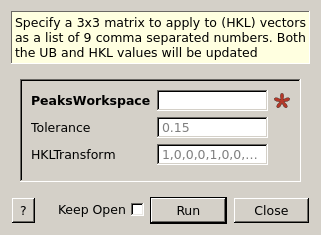 | HKLTransform | Input | dbl list | 1,0,0,0,1,0,0,0,1 | Specify 3x3 HKL transform matrix as a comma separated list of 9 numbers |