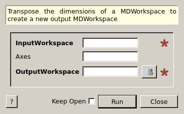 Performs an axis-aligned traspose of a MDHistoWorkspace. Default Axes setting gives not transpose. It is possible to remove dimensions from the input workspace by omitting those dimension indexes from the Axes property. Axes are zero-based indexes.