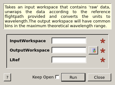 Takes an input workspace that contains ‘raw’ data, unwraps the data according to the reference flightpath provided and converts the units to wavelength.The output workspace will have common bins in the maximum theoretical wavelength range.