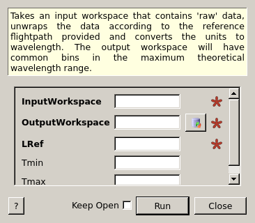 Takes an input workspace that contains ‘raw’ data, unwraps the data according to the reference flightpath provided and converts the units to wavelength. The output workspace will have common bins in the maximum theoretical wavelength range.
