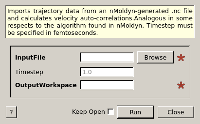 Loads a netcdf file generated by nMoldyn containing MMTK format trajectories. The algorithm calculates, sums and averages velocity auto-correlations of every type of particle. The correlations are not properly scaled with incoherent scattering lengths as of version 1.0.