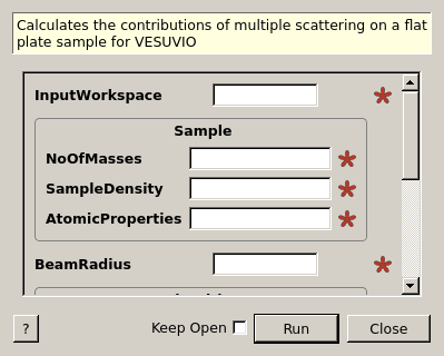 | AtomicProperties | Input | dbl list | Mandatory | Atomic properties of masses within the sample. The expected format is 3 consecutive values per mass: mass(amu), cross-section (barns) & s.d of Compton profile. |