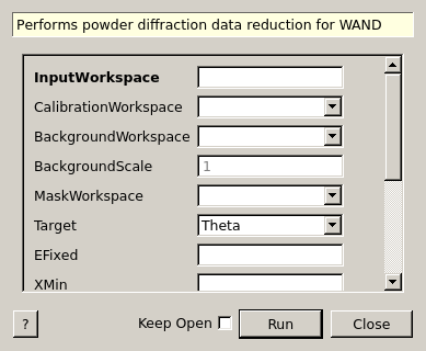 This algorithm performs powder diffraction data reduction for WAND² with calibration, monitor normalization and background subtraction. The CalibrationWorkspace will most likely be a vanadium and will correct for the detector sensitivity. The data can be normalized by monitor count or time. The output workspace can be saved to various formats with SaveFocusedXYE.