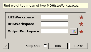 Takes two MDHistoWorkspaces and calculates the weighted mean for each bin. See WeightedMean v1 for more details on the algorithm workings. Both inputs must be MDHistoWorkspaces, the algorithm will not run with MDEventWorkspaces.