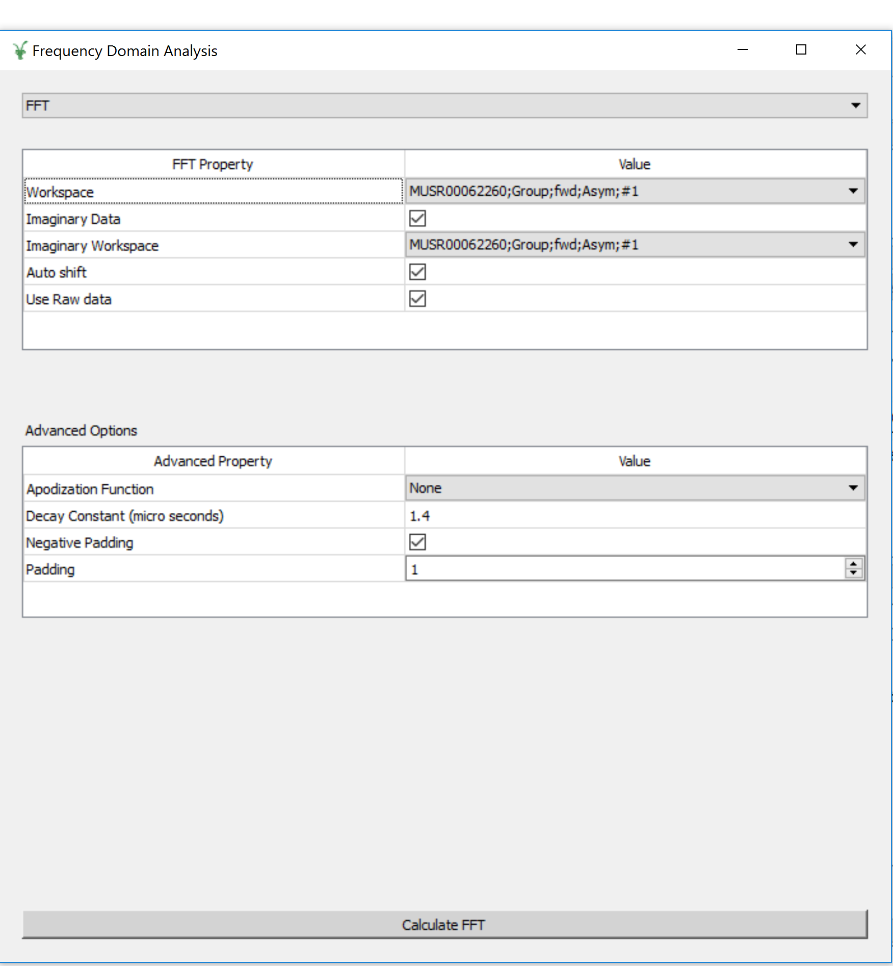 In this mode the interface displays two tables, FFT and Advanced options. The FFT table contains all of the information required to produce a forward FFT. The Advanced Options table contains the information for adding padding and apodization functions to the data.