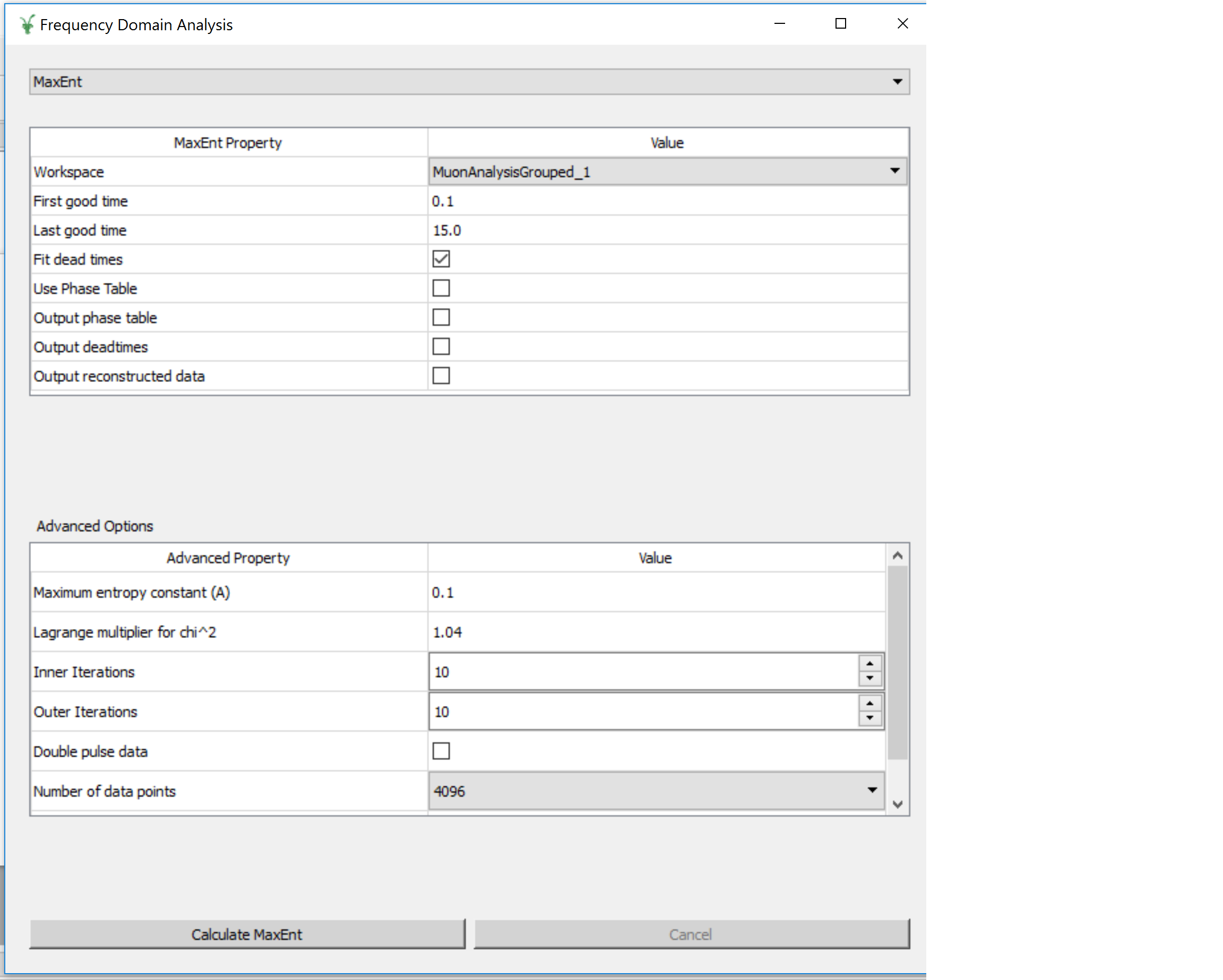 The maximum entropy method can be used to calculate the frequency domain spectrum. This interface uses the MuonMaxent algorithm to calculate the frequency spectrum. The MaxEnt Property table contains
