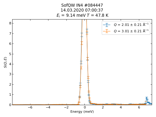 directtools.plotconstE(workspaces, E, dE, style='l', keepCutWorkspaces=True, xscale='linear', yscale='linear')¶Plot line profiles at constant energy transfer from