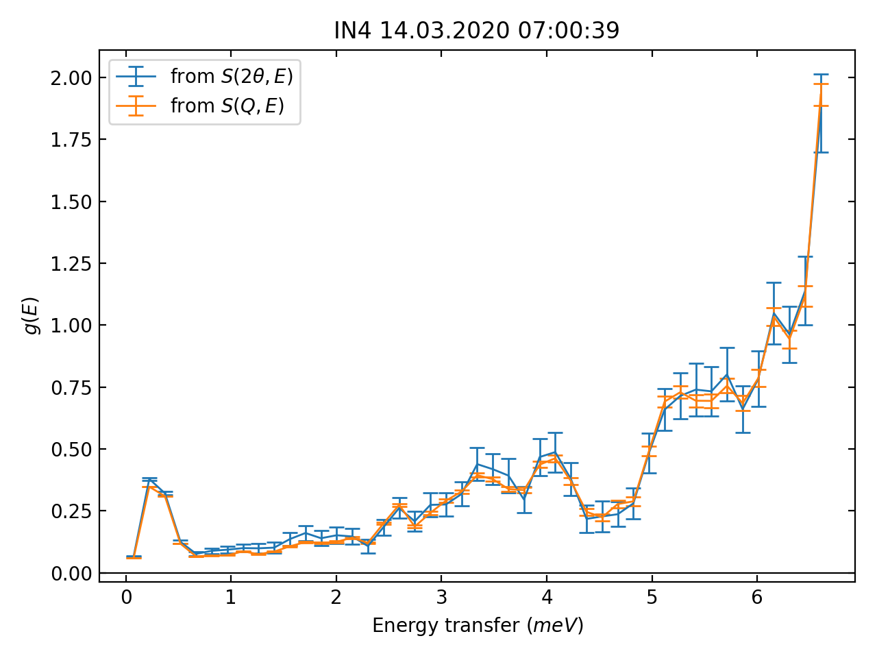 fig, axes = dt.plotDOS([dosFromStw, dosFromSqw], labels=[r'from $S(2\theta, E)$', r'from $S(Q,E)$'])