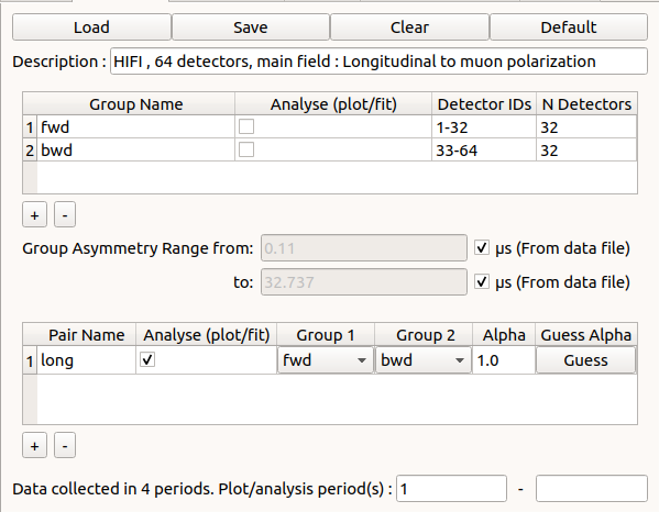 Group Asymmetry Range Controls the range to use when estimating the group asymmetry. The values are used as StartX and EndX in EstimateMuonAsymmetryFromCounts. By default this range is the first good data and end time value from the file