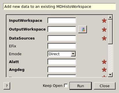 | InputWorkspace | Input | MDEventWorkspace | Mandatory | An input MDEventWorkspace to append data to. |