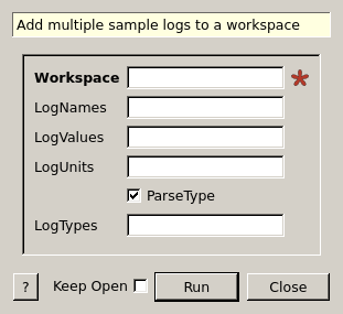This algorithm provides a way of adding multiple sample log entries to a workspace at once by making multiple calls to the AddSampleLog v1 algorithm.