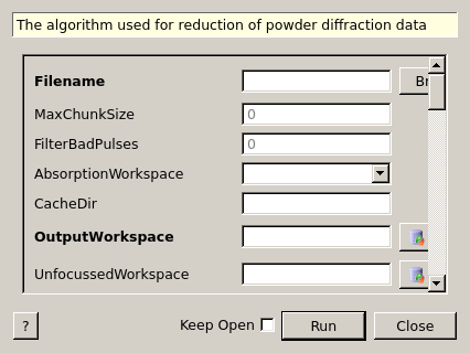 | UnfocussedWorkspace | Output | MatrixWorkspace | Treated data in d-spacing before focussing (optional). This will likely need rebinning. | |
