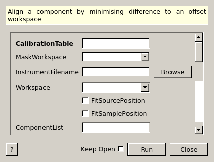 | FitSamplePosition | Input | boolean | False | Fit the sample position, changes L1 (source to sample) and L2 (sample to detector) distance.Uses entire instrument. Occurs before Components are Aligned. |