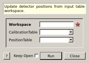 | PositionTable | Input | TableWorkspace | Deprecated: Use Property ‘CalibrationTable’ |