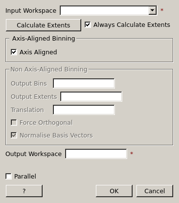 | AxisAligned | Input | boolean | True | Perform binning aligned with the axes of the input MDEventWorkspace? |