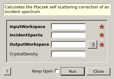 | OutputWorkspace | Output | MatrixWorkspace | Mandatory | Workspace with the Self scattering correction |