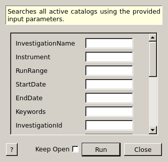 This algorithm searches through the all active catalogs for investigations based on the parameters set, and saves the results into a workspace.