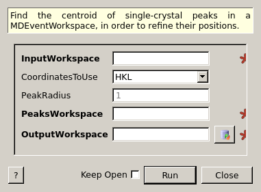 | PeaksWorkspace | Input | PeaksWorkspace | Mandatory | A PeaksWorkspace containing the peaks to centroid. |