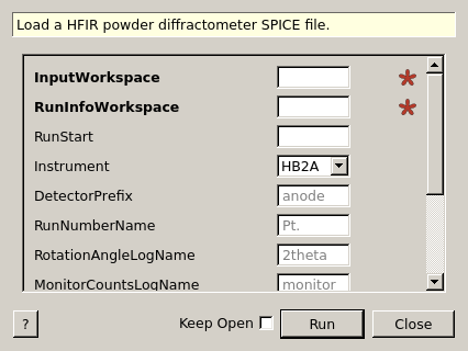 | Instrument | Input | string | HB2A | Instrument to be loaded. Allowed values: [‘HB2A’] |