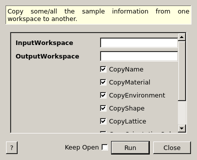 | OutputWorkspace | InOut | Workspace | Mandatory | An output workspace to wich to copy sample information.. |