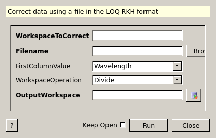 FirstColumnValue Input string Wavelength The units of the first column of the correction file (default wavelength). Allowed values: [‘AtomicDistance’, ‘Degrees’, ‘DeltaE’, ‘DeltaE_inFrequency’, ‘DeltaE_inWavenumber’, ‘dSpacing’, ‘dSpacingPerpendicular’, ‘Empty’, ‘Energy’, ‘Energy_inWavenumber’, ‘Label’, ‘Momentum’, ‘MomentumTransfer’, ‘Phi’, ‘QSquared’, ‘SpinEchoLength’, ‘SpinEchoTime’, ‘Temperature’, ‘Time’, ‘TOF’, ‘Wavelength’, ‘SpectrumNumber’]