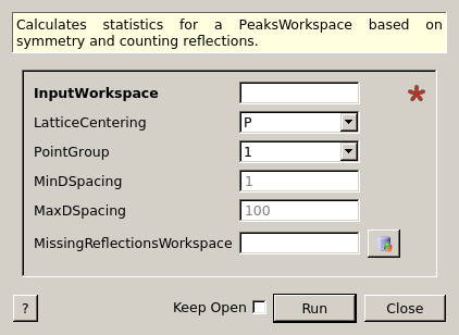 | InputWorkspace | Input | PeaksWorkspace | Mandatory | A workspace with peaks to calculate statistics for. Sample with valid UB-matrix is required. |