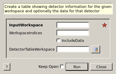 | DetectorTableWorkspace | Output | TableWorkspace | The name of the outputted detector table workspace, if left empty then the input workspace name + “-Detectors” is used. |