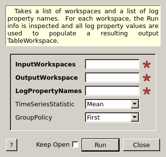 Takes a list of workspaces and a list of log property names. For each workspace, the Run info is inspected and all log property values are used to populate a resulting output TableWorkspace.