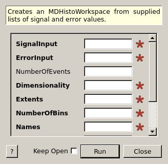 A very similar algorithm to this is ImportMDHistoWorkspace v1, which takes it’s input signal and error values from a text file rather than from arrays. Another alternative is to use ConvertToMD v1 which works on MatrixWorkspaces, and allows log values to be included in the dimensionality.