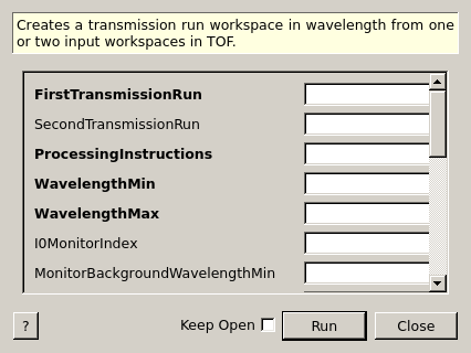 FirstTransmissionRun Input MatrixWorkspace Mandatory First transmission run. Corresponds to the low wavelength transmission run if a SecondTransmissionRun is also provided.