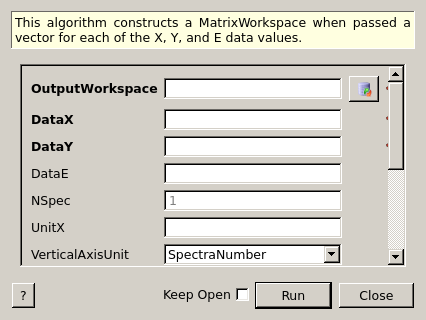 This algorithm constructs a MatrixWorkspace when passed a vector for each of the X, Y and optionally E and Dx values. The E values of the output workspace will be zero if not provided. The unit for the X Axis can optionally be specified as any of the units in the Mantid Unit Factory. Multiple spectra may be created by supplying the NSpec Property (integer, default 1). When this is provided the vectors are split into equal-sized spectra (all X, Y, E, Dx values must still be in a single vector for input).
