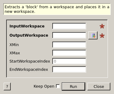 Extracts a ‘block’ from a workspace and places it in a new workspace (or, to look at it another way, lops bins or spectra off a workspace).
