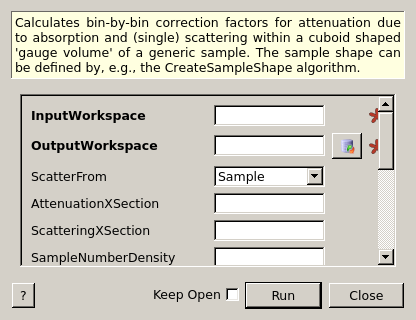 Calculates bin-by-bin correction factors for attenuation due to absorption and (single) scattering within a cuboid shaped ‘gauge volume’ of a generic sample. The sample shape can be defined by, e.g., the CreateSampleShape algorithm.