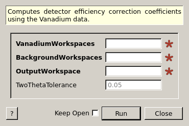 This algorithm computes detector efficiency correction coefficients using a given Vanadium and background workspaces. As a result, output workspace or group of workspaces with coefficients will be created.