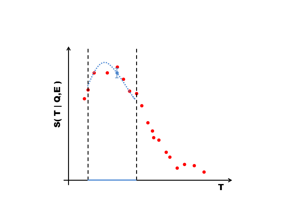 Interpolated spline (solid line) with associated errors at one (Q,E) dynamical channel. Red dots are values from the simulation used to construct the spline.