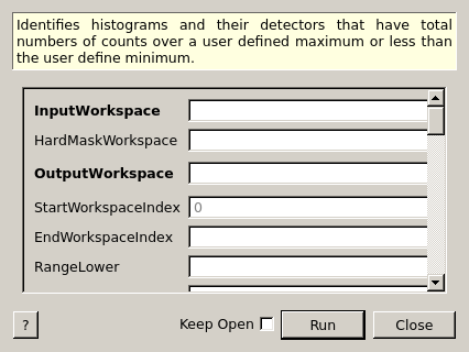 | RangeUpper | Input | number | Optional | No bin with a boundary at an x value higher than this value will be used in the summation that decides if a detector is ‘bad’ (default: the end of each histogram) |