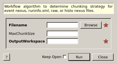 | Filename | Input | string | Mandatory | The name of the event nexus, runinfo.xml, raw, or histo nexus file to read, including its full or relative path. The Event NeXus file name is typically of the form INST_####_event.nxs (N.B. case sensitive if running on Linux). Allowed extensions: [‘.nxs’, ‘.nxs.h5’, ‘.raw’, ‘_event.nxs’, ‘_histo.nxs’, ‘_runinfo.xml’] |