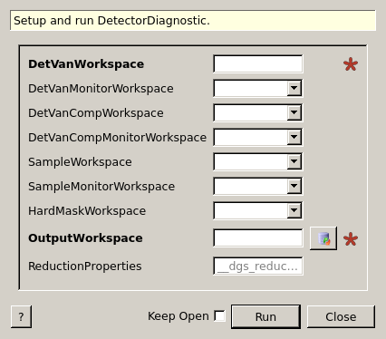 | SampleWorkspace | Input | MatrixWorkspace | A sample workspace to run some diagnostics on. | |